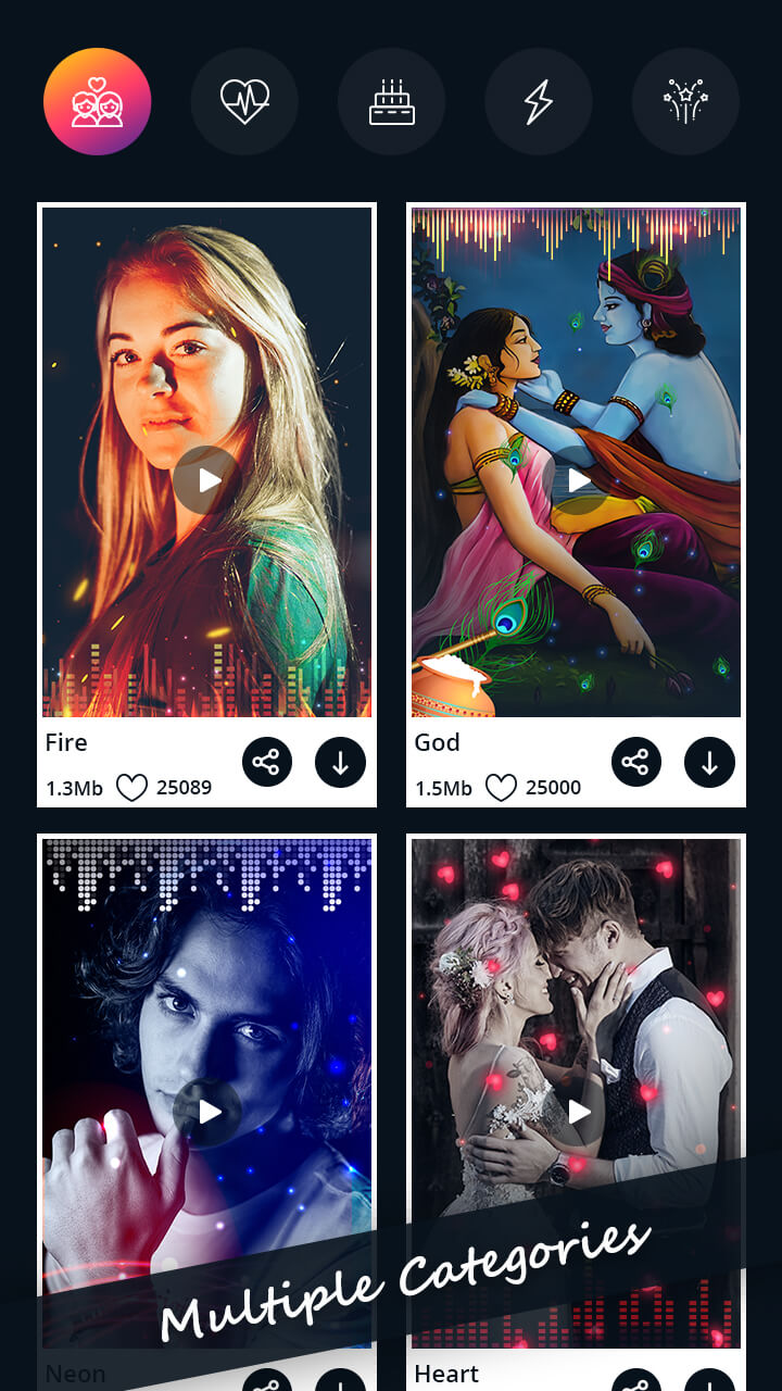 You can make Unique Video status for Love, Birthday, God, Festival and Greetings with Beat wise particle effects with your Favorite song track.